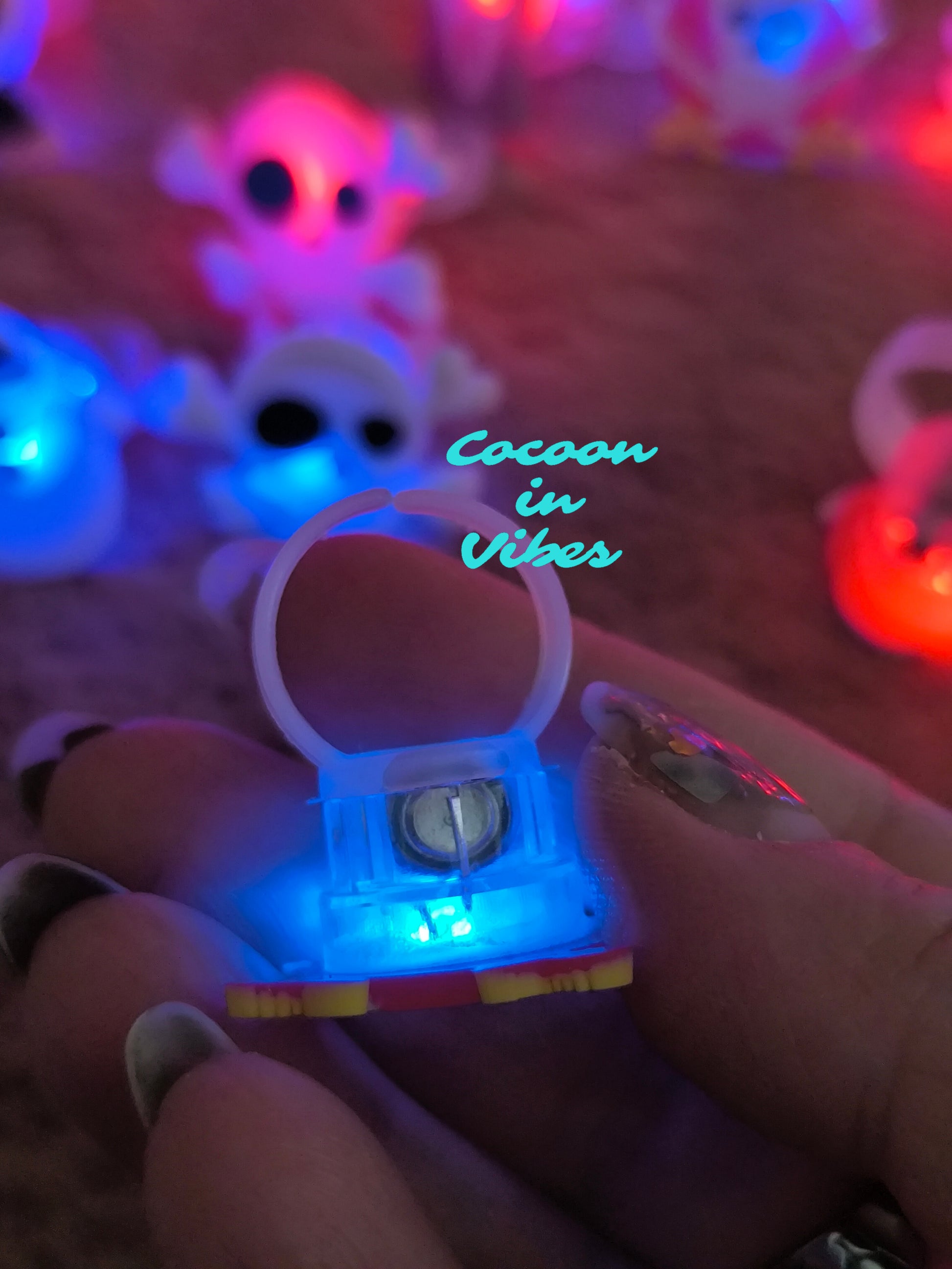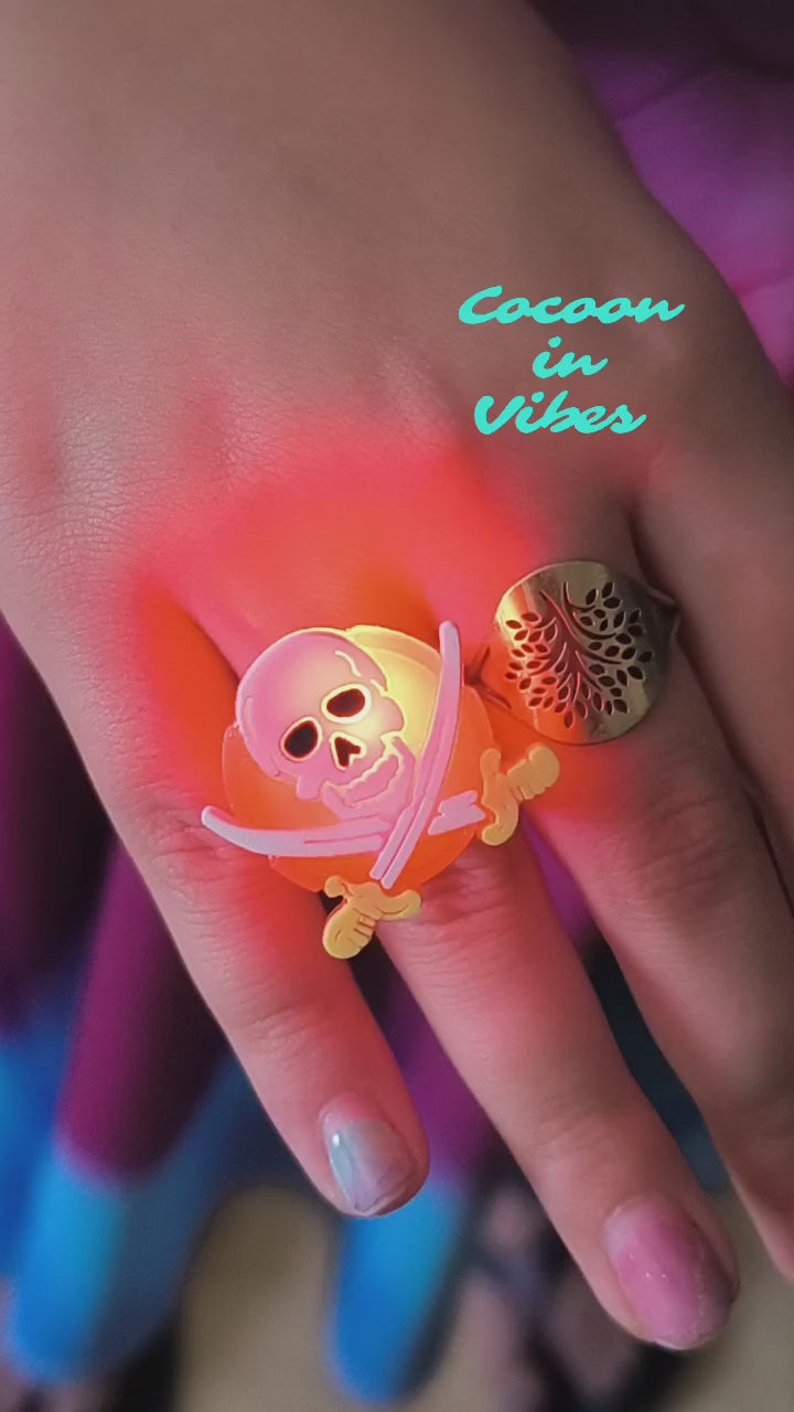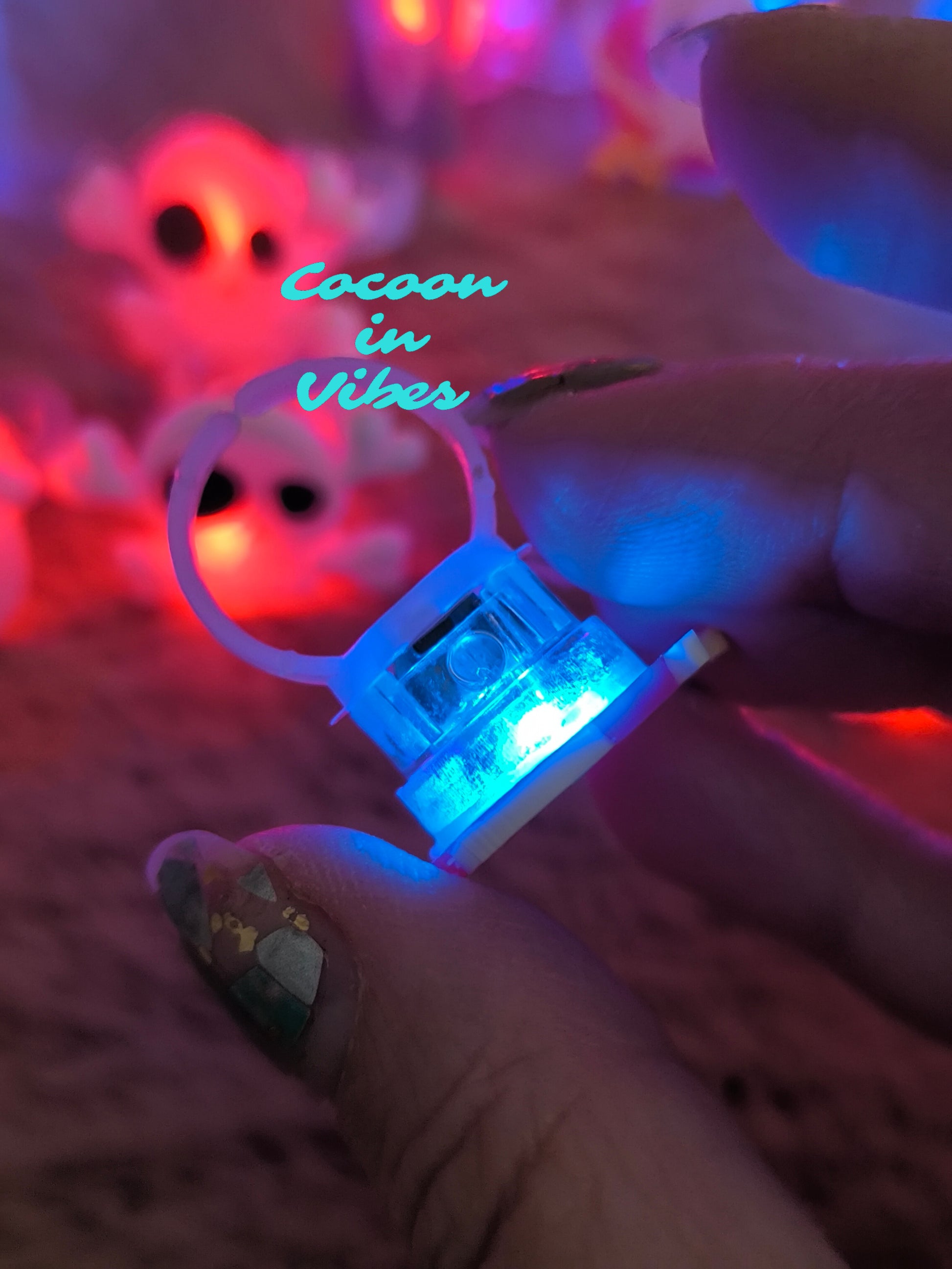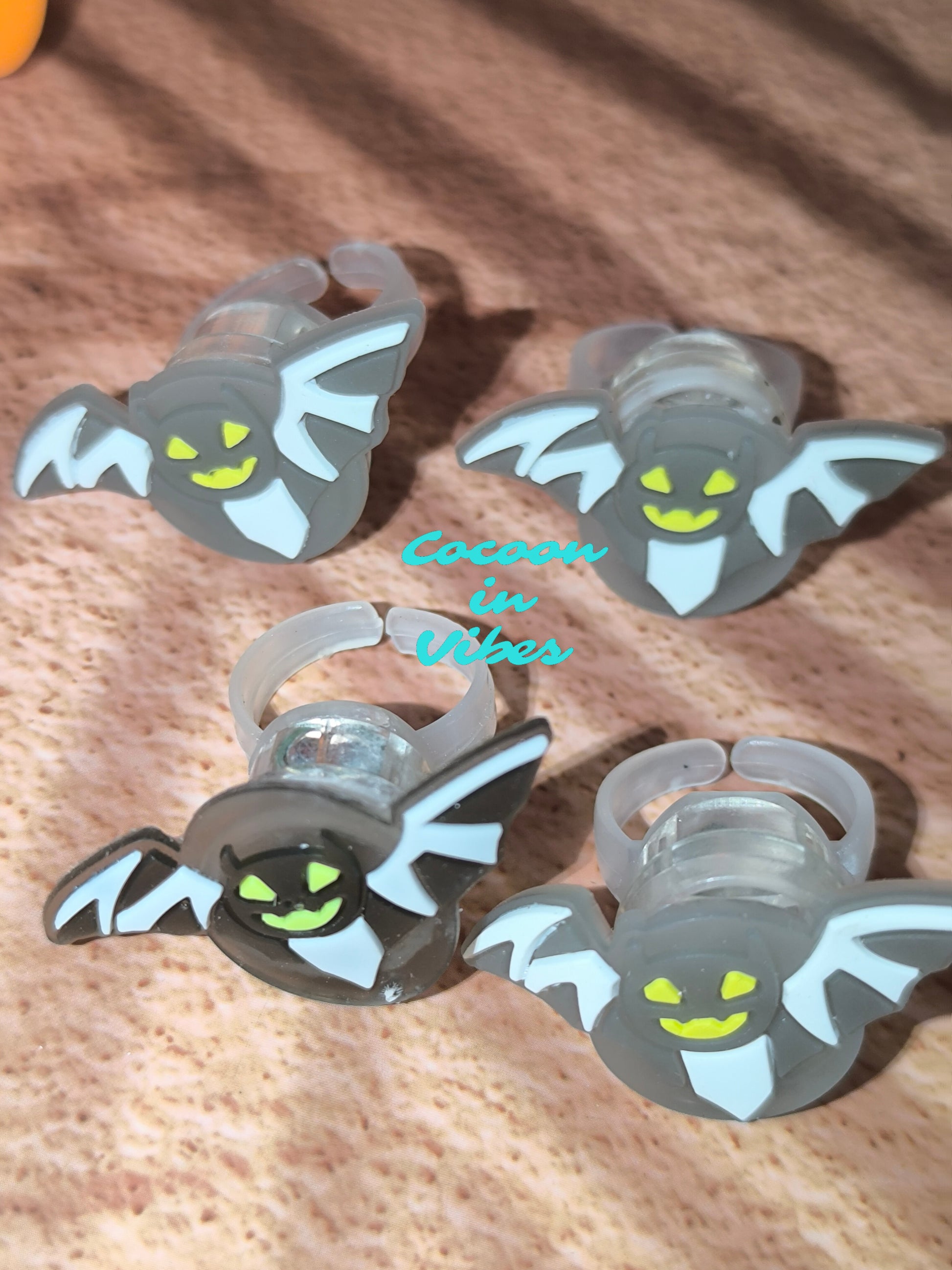 Un petit bouton permet d’allumer et d’éteindre la bague. Parfois un peu ferme, il suffit de manipuler doucement pour enclencher ou arrêter la lumière. Une fois activées, les bagues clignotent et brillent dans le noir pour rendre Halloween encore plus magique !