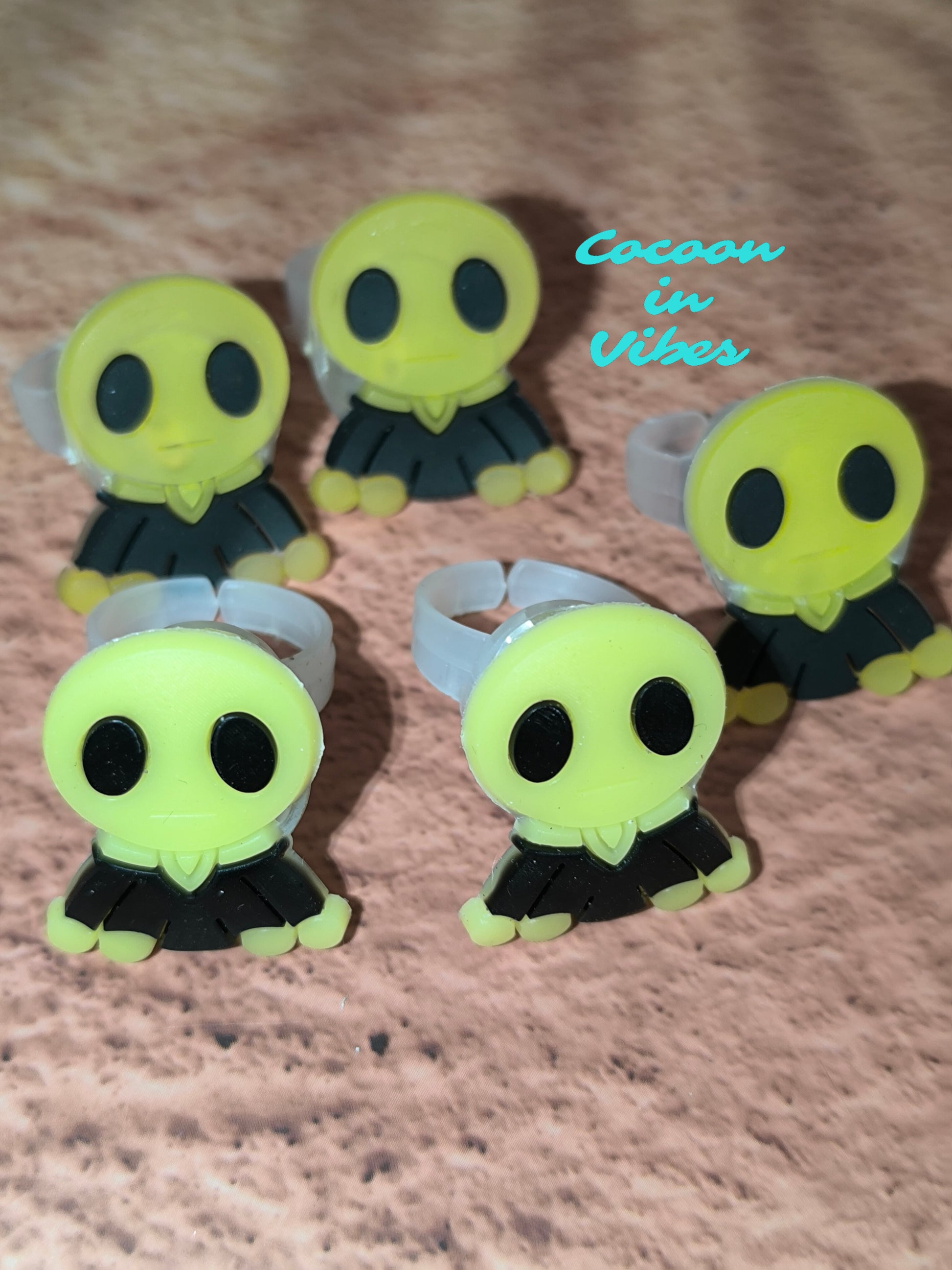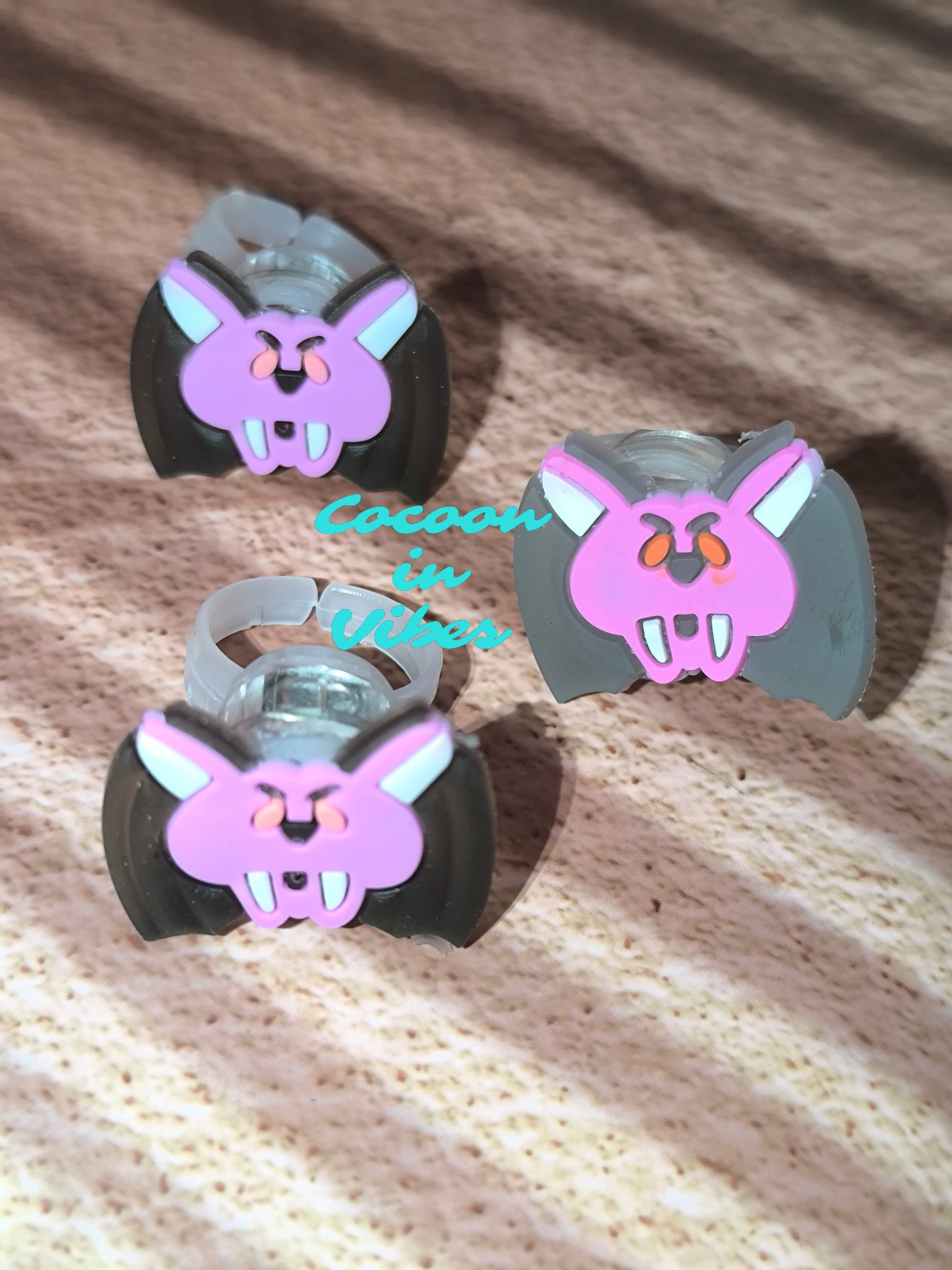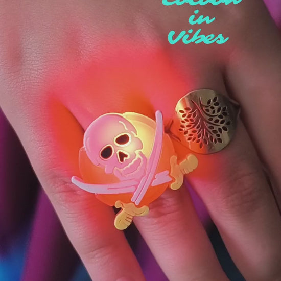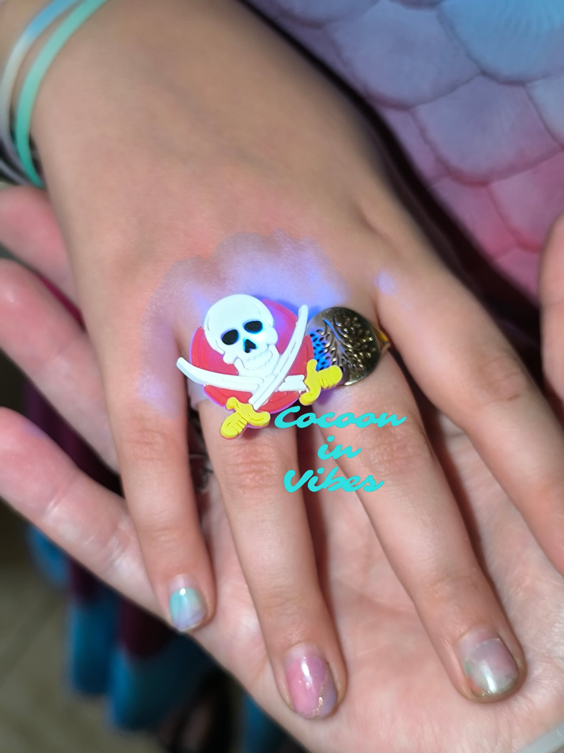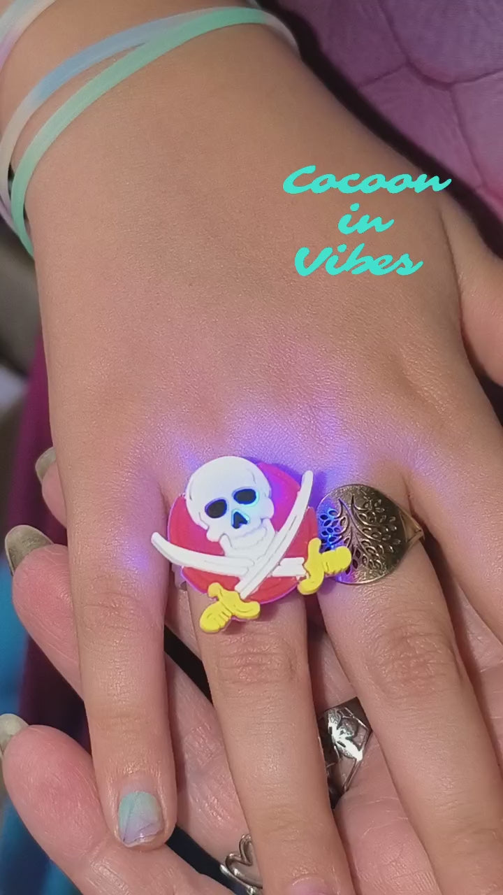 Un petit bouton permet d’allumer et d’éteindre la bague. Parfois un peu ferme, il suffit de manipuler doucement pour enclencher ou arrêter la lumière. Une fois activées, les bagues clignotent et brillent dans le noir pour rendre Halloween encore plus magique !