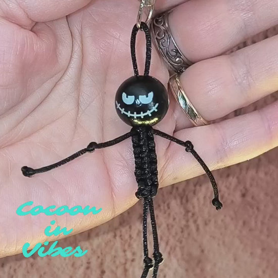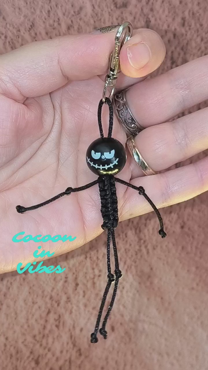 đ§” EntiĂšrement fait main par moi mĂȘme pour Cocoon in Vibes, en cordon satinĂ© noir, avec sa tĂȘte en perle en bois noire, ce petit squelette-monstre a Ă©tĂ© patiemment nouĂ© en macramĂ© pour lui donner un corps articulĂ© : les coudes, les genoux, les mains et les pieds sont marquĂ©s par de dĂ©licats nĆuds, lui donnant une allure malicieuse et pleine de caractĂšre.