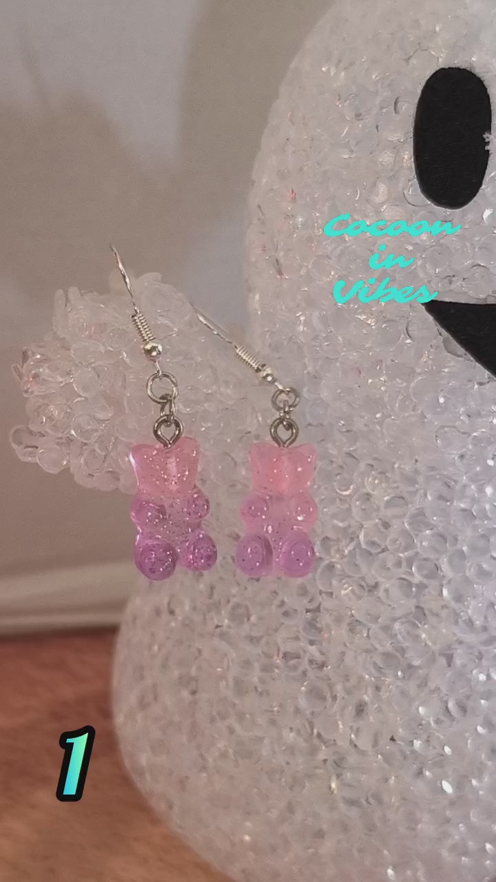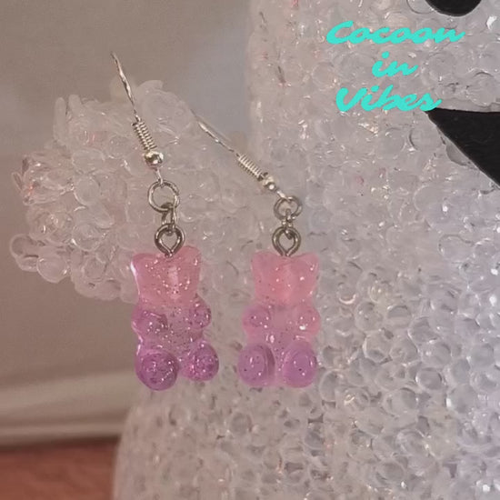 Boucles d’oreilles Nounours Gélifiés – N°1 Rose → Parme Translucide Pailleté (Création artisanale Cocoon In Vibes)