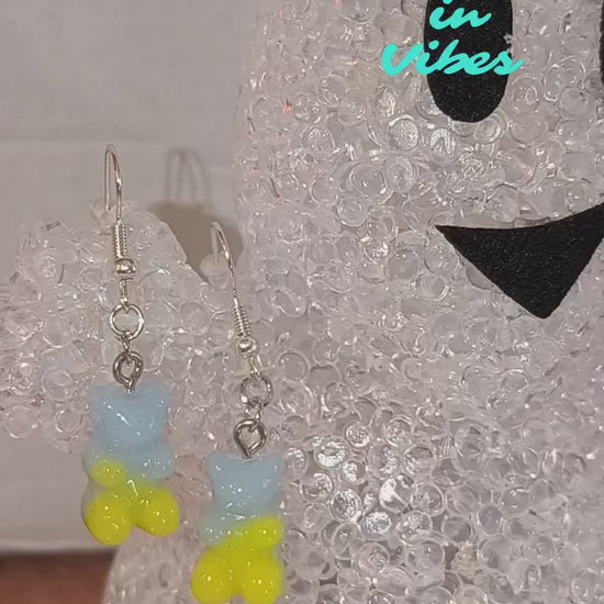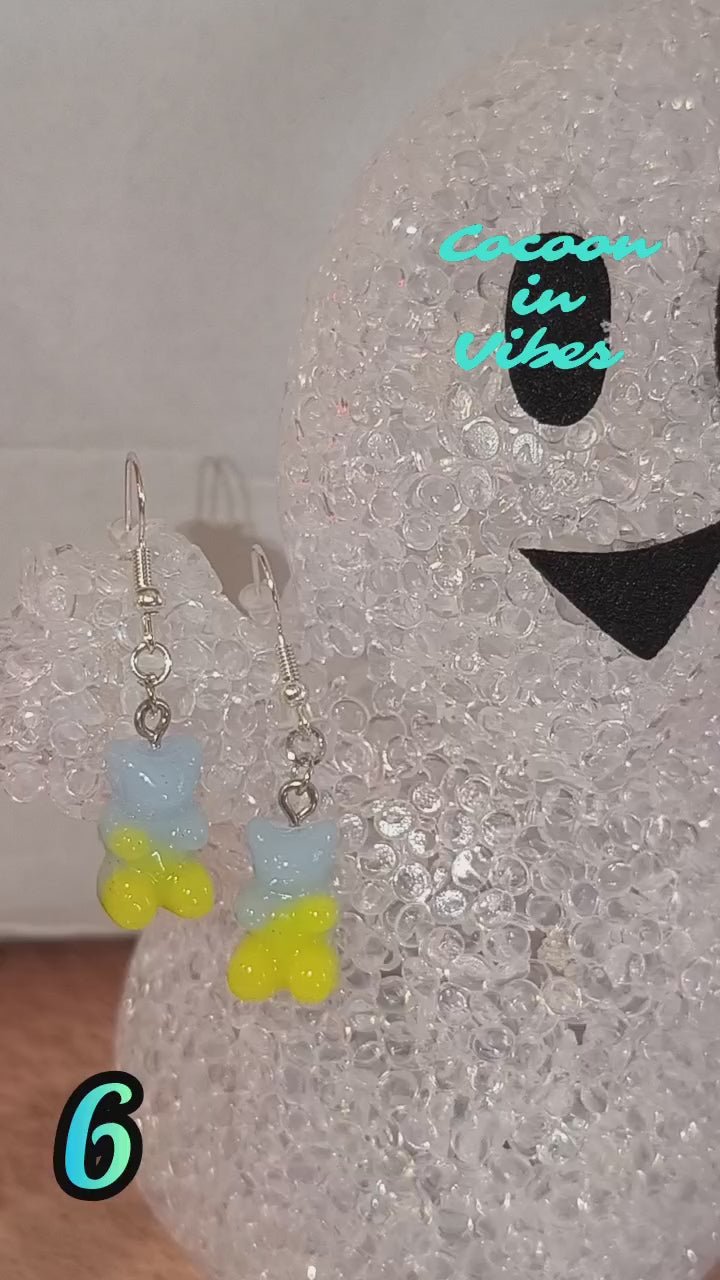 Boucles d’oreilles Nounours Gélifiés – N°6 Bleu Clair / Bleu-Gris → Jaune Opaque Pailletée (Création artisanale Cocoon In Vibes)