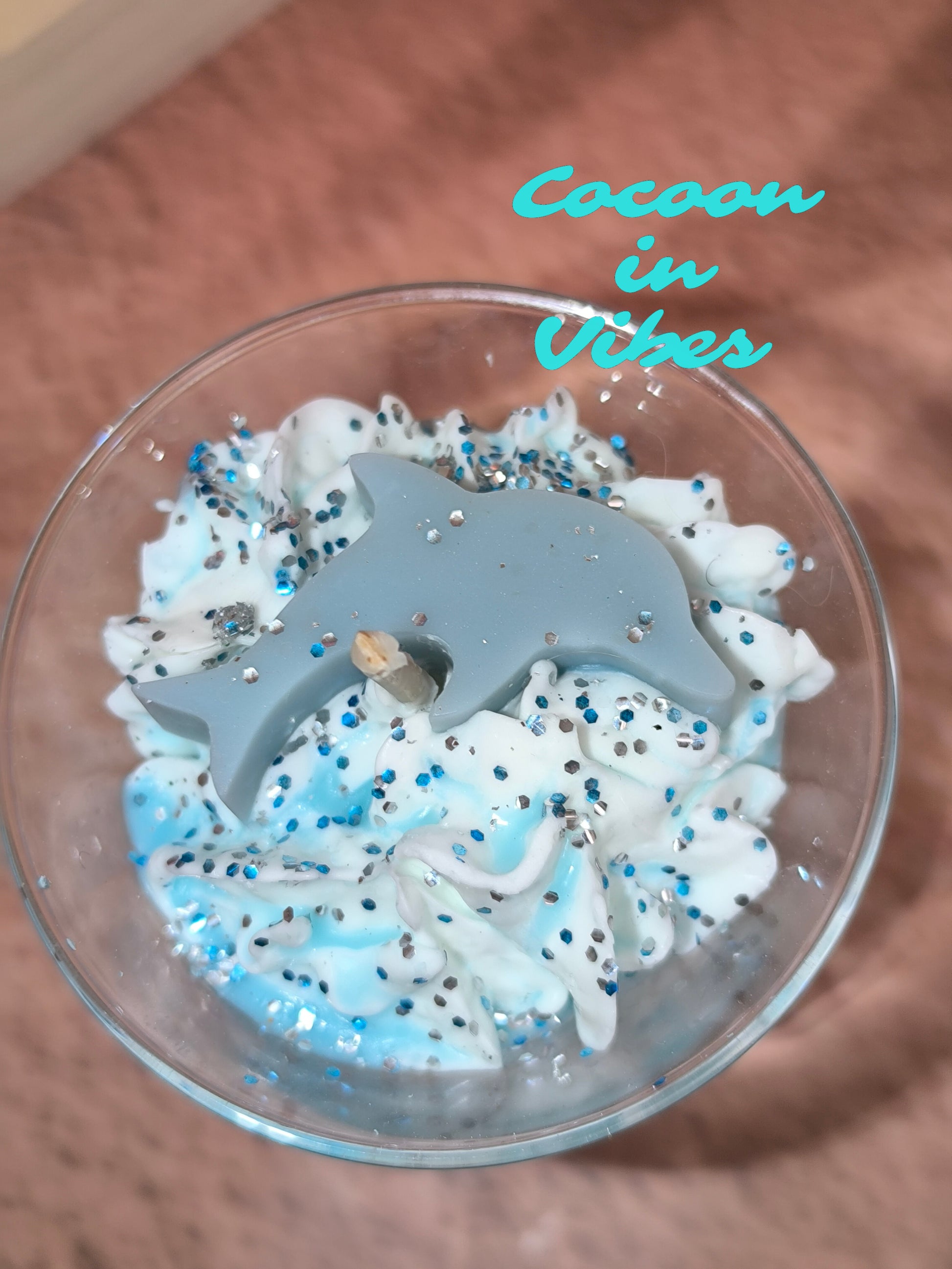 🐬 Ornée d’un fondant en forme de dauphin bleu scintillant de paillettes et coiffée d’une chantilly bicolore blanche et bleue, elle est à la fois objet de décoration et invitation au voyage. Son parfum envoûtant de monoï transforme instantanément votre intérieur en un doux cocon aux accents tropicaux.