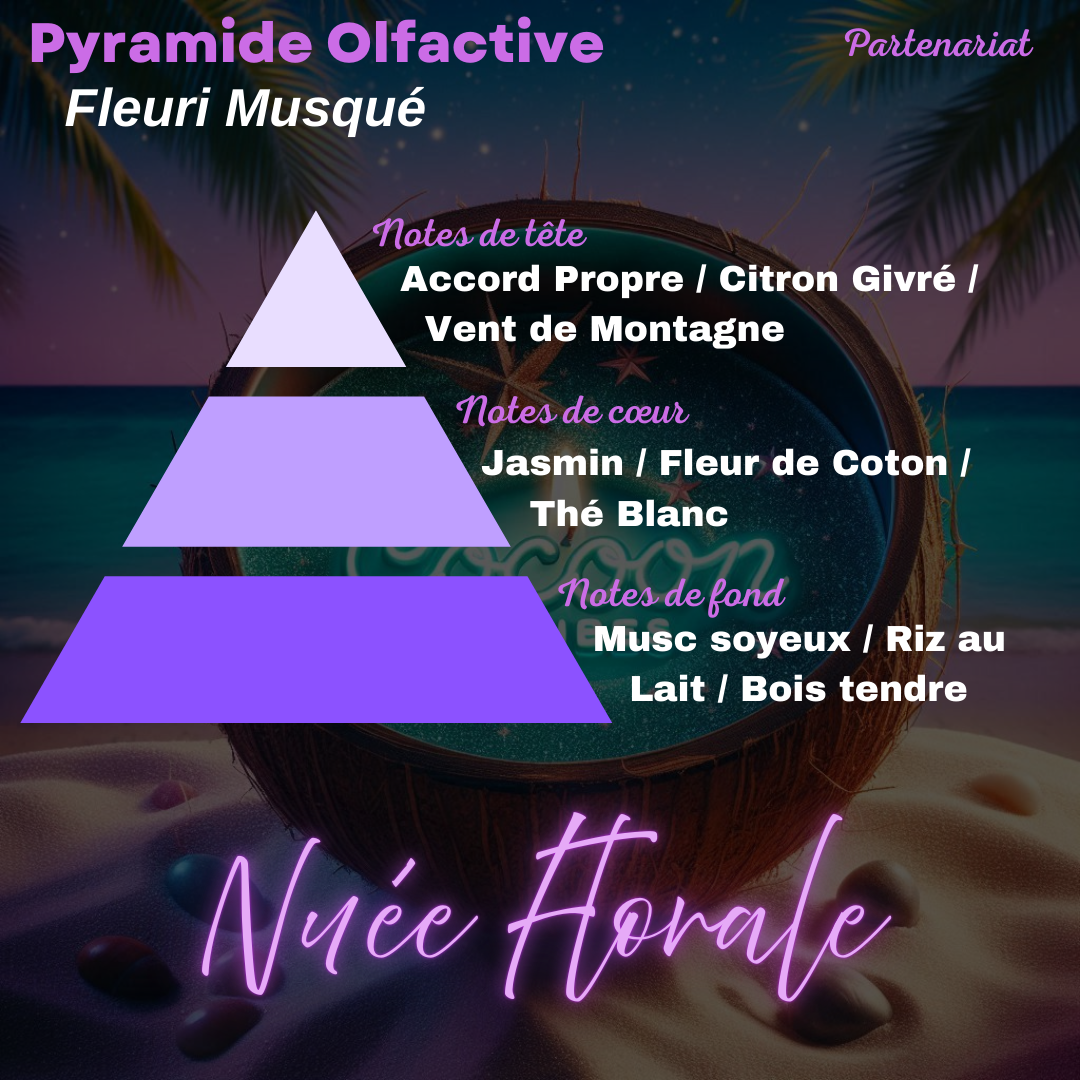 Senteur : Nuée Florale – douce, élégante et délicatement parfumée (pyramide olfactive en photo)
