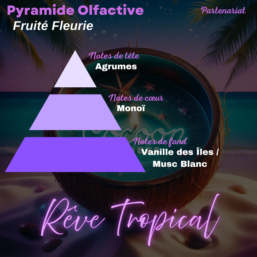 Senteur : Rêve Tropical – exotique, ensoleillée et délicieusement fruitée (pyramide olfactive en photo)
