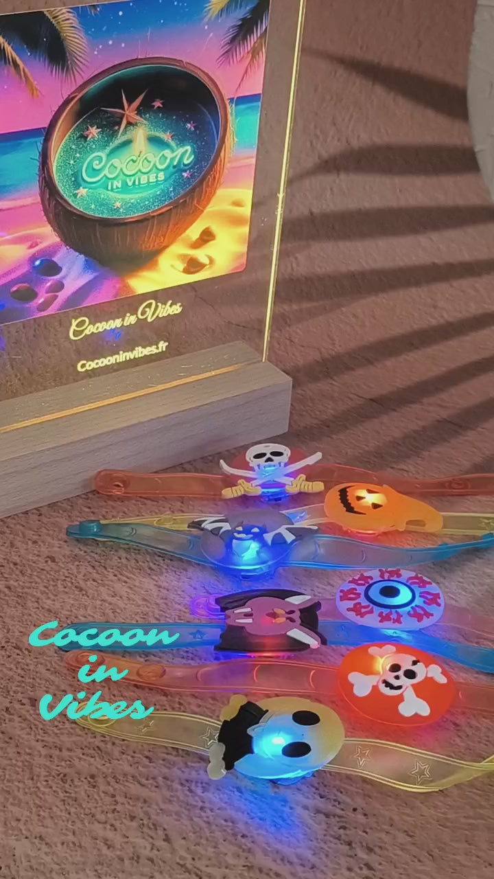 🏴☠️ Avec leurs motifs rigolos et effrayants – pirates, citrouilles, fantômes et autres monstres malicieux – ils ajoutent une touche fun à chaque costume. Les enfants adorent les allumer et voir leurs bracelets scintiller dans l’obscurité, comme de véritables trésors lumineux qui les accompagnent tout au long de la soirée.