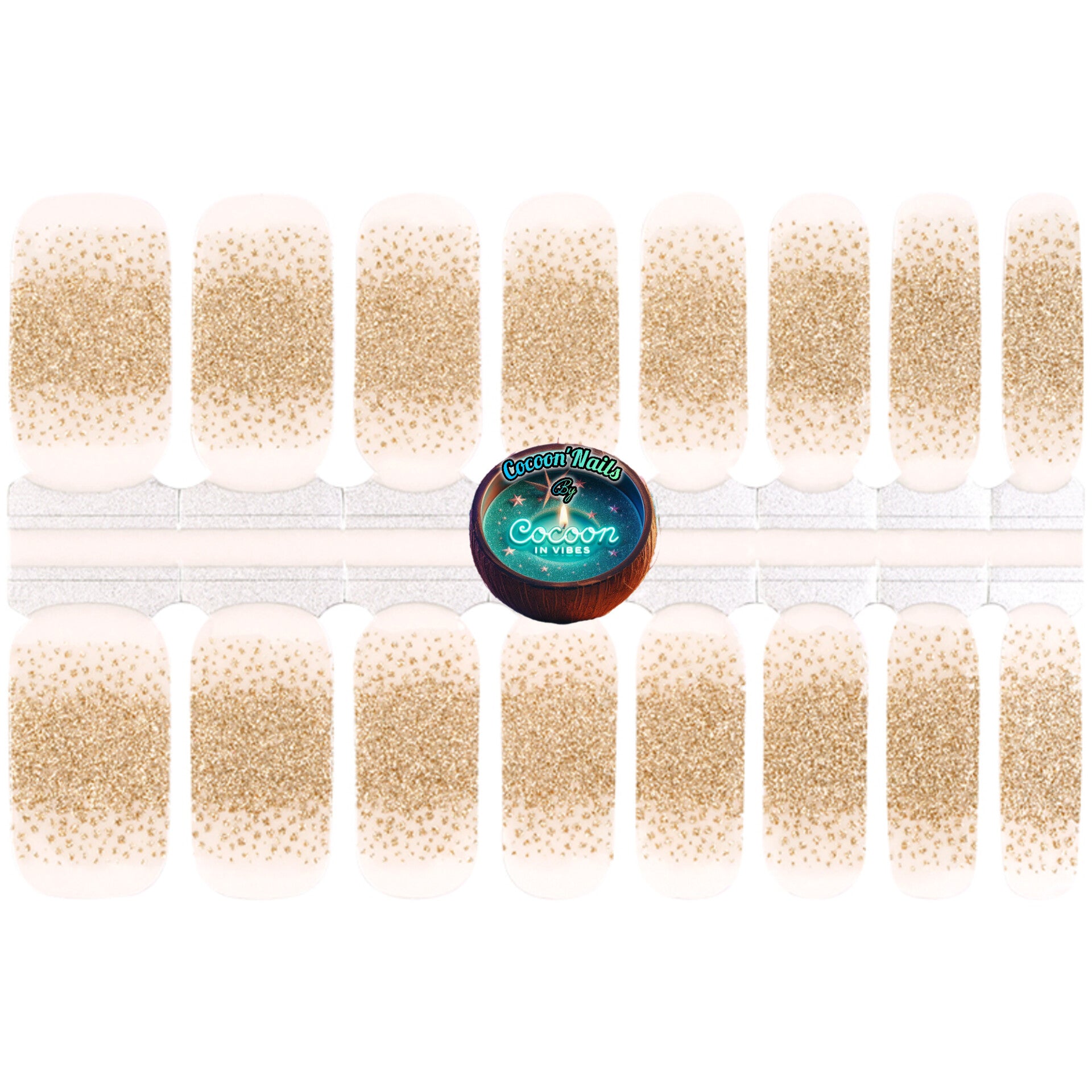 Son dégradé de paillettes dorées, concentrées au centre puis qui s’estompent doucement vers la transparence, crée un rendu chic, lumineux et raffiné, parfait pour briller sans en faire trop 💫