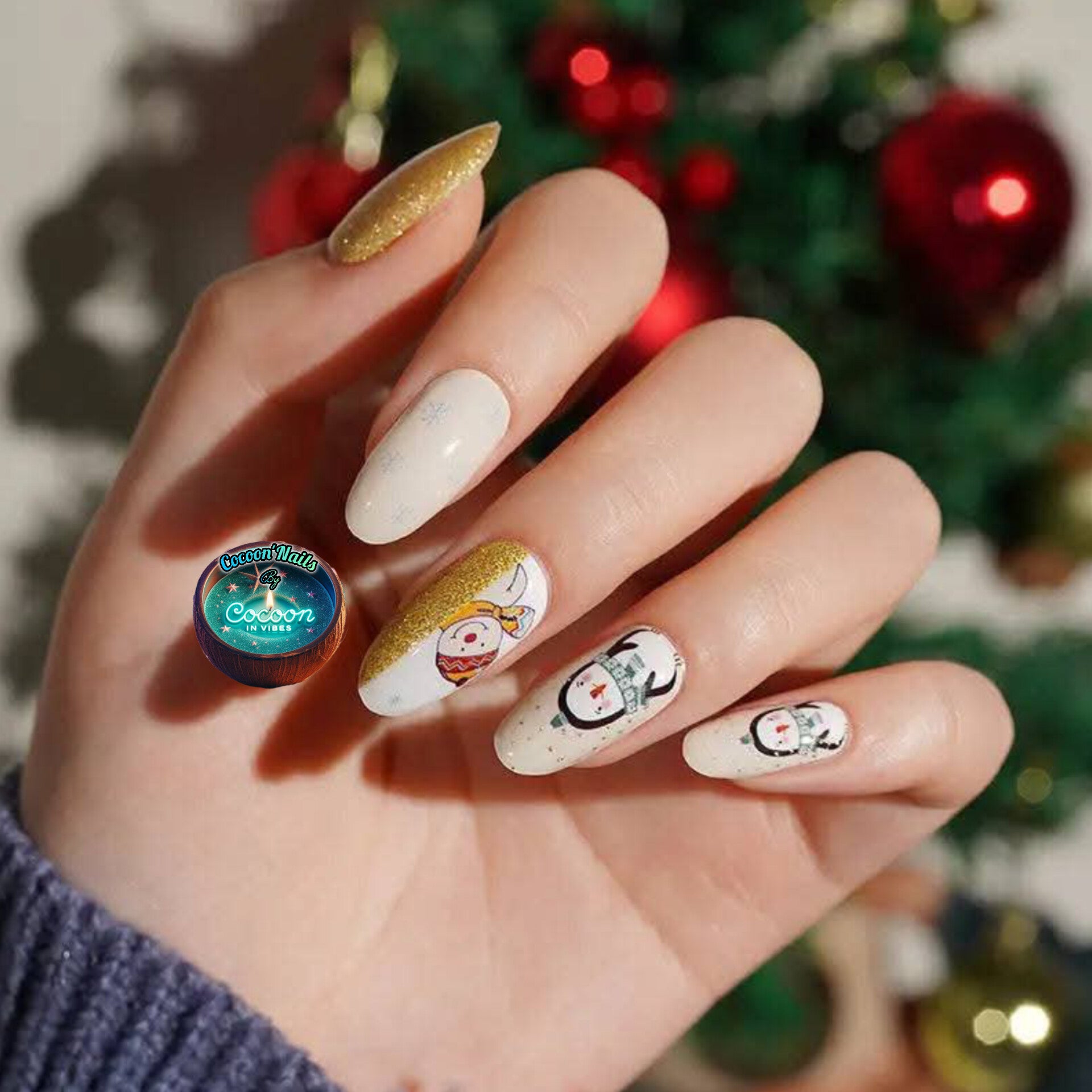 De petits pingouins malicieux, des flocons délicats et des touches dorées pailletées se mêlent au blanc neigeux pour créer une manucure à la fois festive, douce et pleine de charme 💛❄️