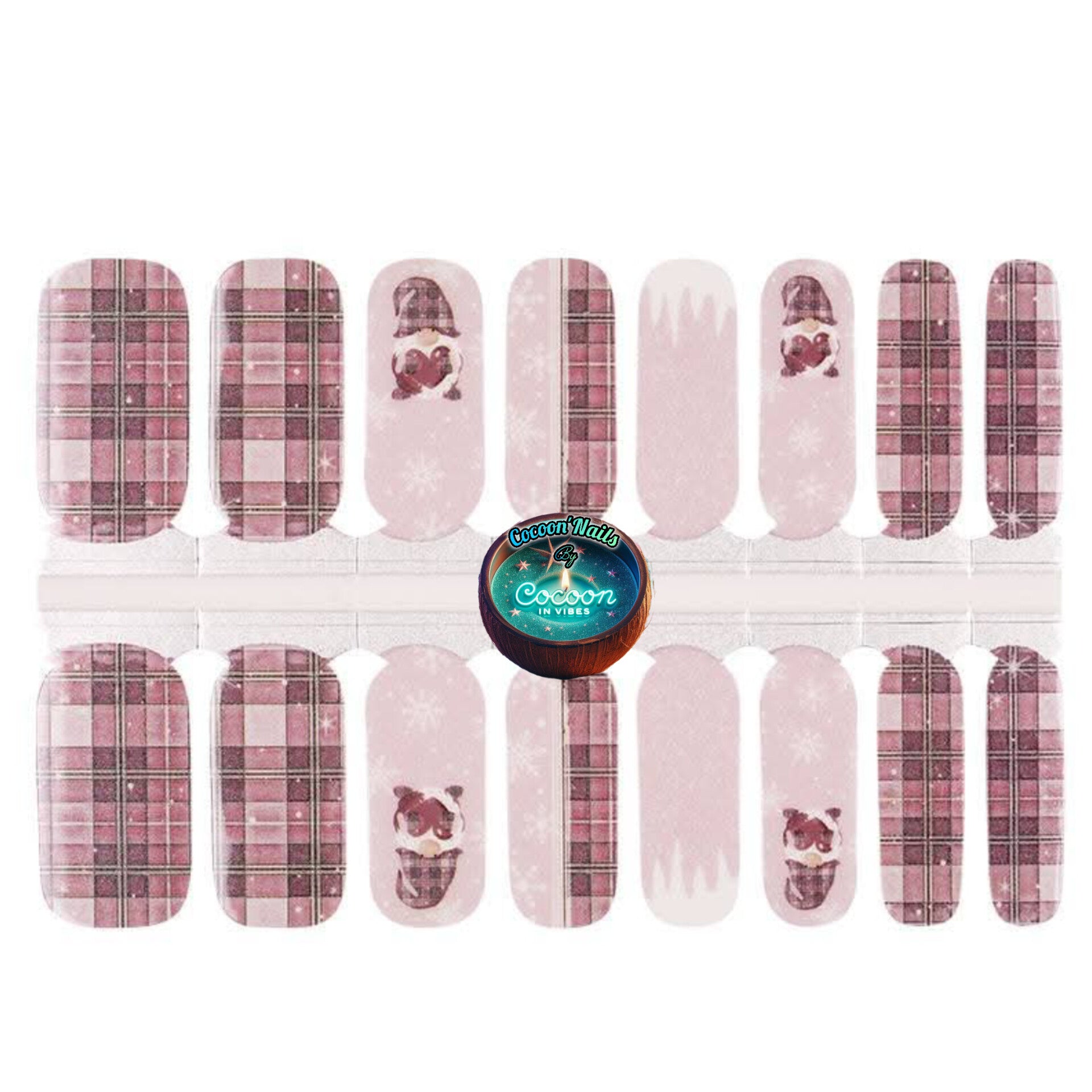 Avec Sweet Winter Gnome, chaque ongle raconte une histoire pleine de charme et de tendresse : de mignons petits gnomes tenant un cœur ❤️, des motifs écossais élégants 🧣, et des flocons délicats ❄️ qui tombent doucement sur un fond de rose, vieux rose, bordeaux et blanc cassé.