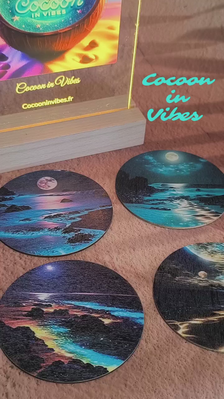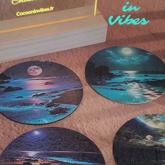 🌊 Les dessous de tasse / de verre "Pleine Lune sur la Mer" (diamètre 10 cm) immortalisent la magie de ces nuits où l’horizon se transforme en tableau.