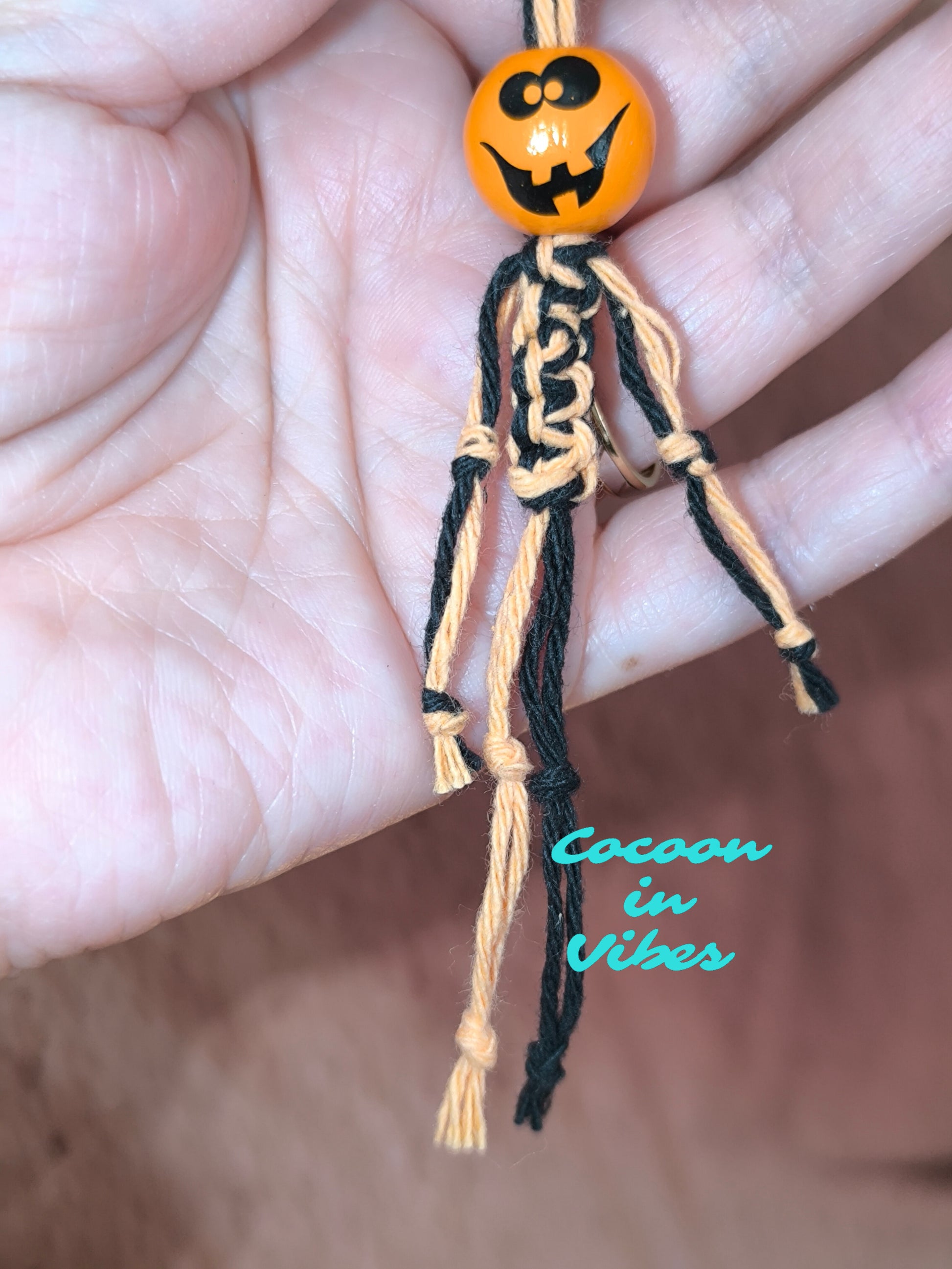 🖤🧡 Son corps, entièrement réalisé en noeuds de macramé, mélange le noir et l’orange pour un effet bicolore unique.